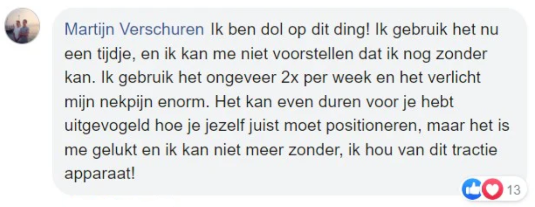 van de gebruikers meldden dat ze hun nekbochel hadden verminderd en hun voorwaartse hoofdhouding hadden hersteld na 10 dagen van consistent gebruik (15-20 minuten per dag).