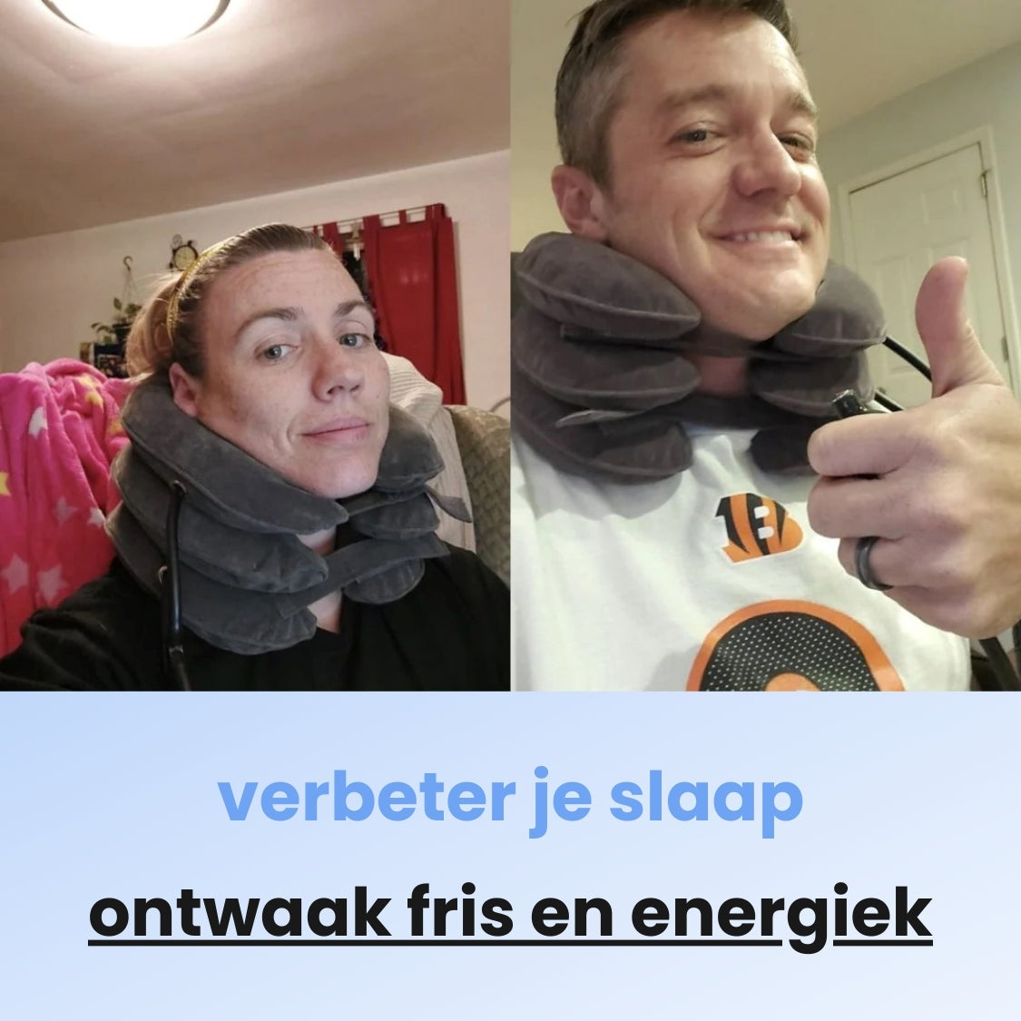 Ontworpen om een goede uitlijning van de nek te bevorderen, maakt de NekStrek™ gebruik van het gepatenteerde driemethoden cervicale tractie technologie om stijve spieren rond je nek te versoepelen. Dit geeft ze de mogelijkheid om in hun natuurlijke positie terug te keren, waardoor je makkelijker en dieper slaapt & je overdag beter voelt.