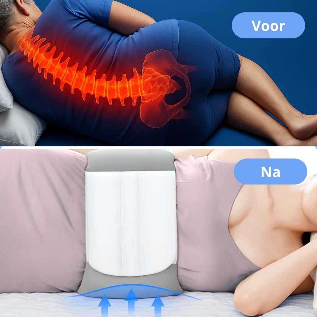 Door je onderrug stabiel te houden en spanning op spieren te verminderen, helpt het kussen nieuwe klachten te voorkomen en bevordert het een gezonde, rechte houding — zowel ’s nachts als overdag.